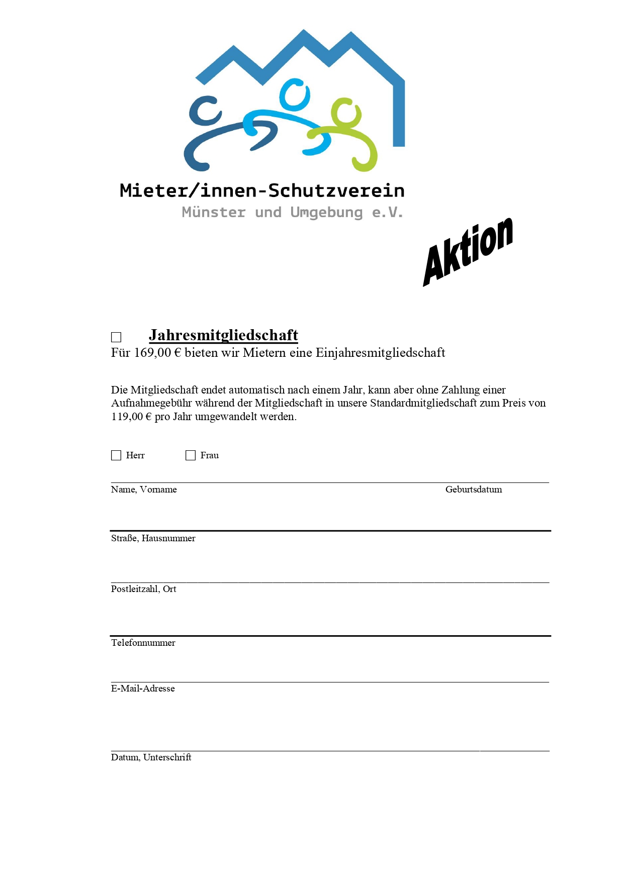 Mietern, die nur ein befristetes Beratungsinteresse haben, bieten wir eine Einjahresmitgliedschaft mit einem Beitrag in Höhe von 169,00 Euro an. Die Mitgliedschaft endet automatisch nach einem Jahr, kann aber ohne Zahlung einer weiteren Aufnahmegebühr während der Mitgliedschaft in eine reguläre Mitgliedschaft umgewandelt werden.